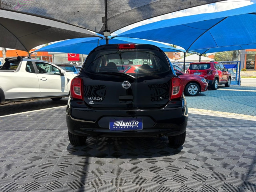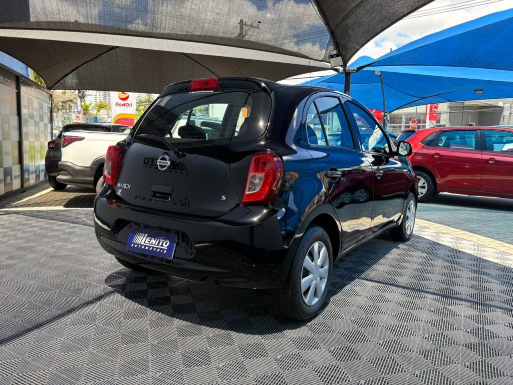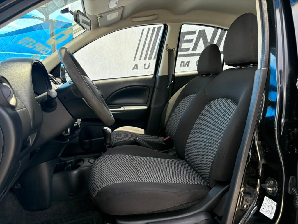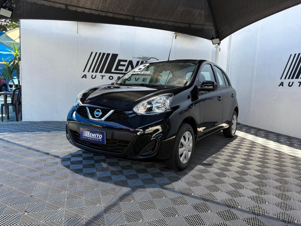 Nissan March S 2018 manual, hatch preto ágil para cidade, viagens curtas e apps, com pegada econômica e fácil de estacionar. Câmbio de 5 marchas, direção elétrica, ar-condicionado, vidros dianteiros e travas elétricas, som com Bluetooth/USB, volante multifuncional, computador de bordo, airbags, ABS e Isofix. Público ideal: primeiros motoristas, famílias compactas e quem busca baixo custo. Forças: consumo, praticidade, manutenção acessível. Oportunidade: garanta este March hoje. | Cor: Preto