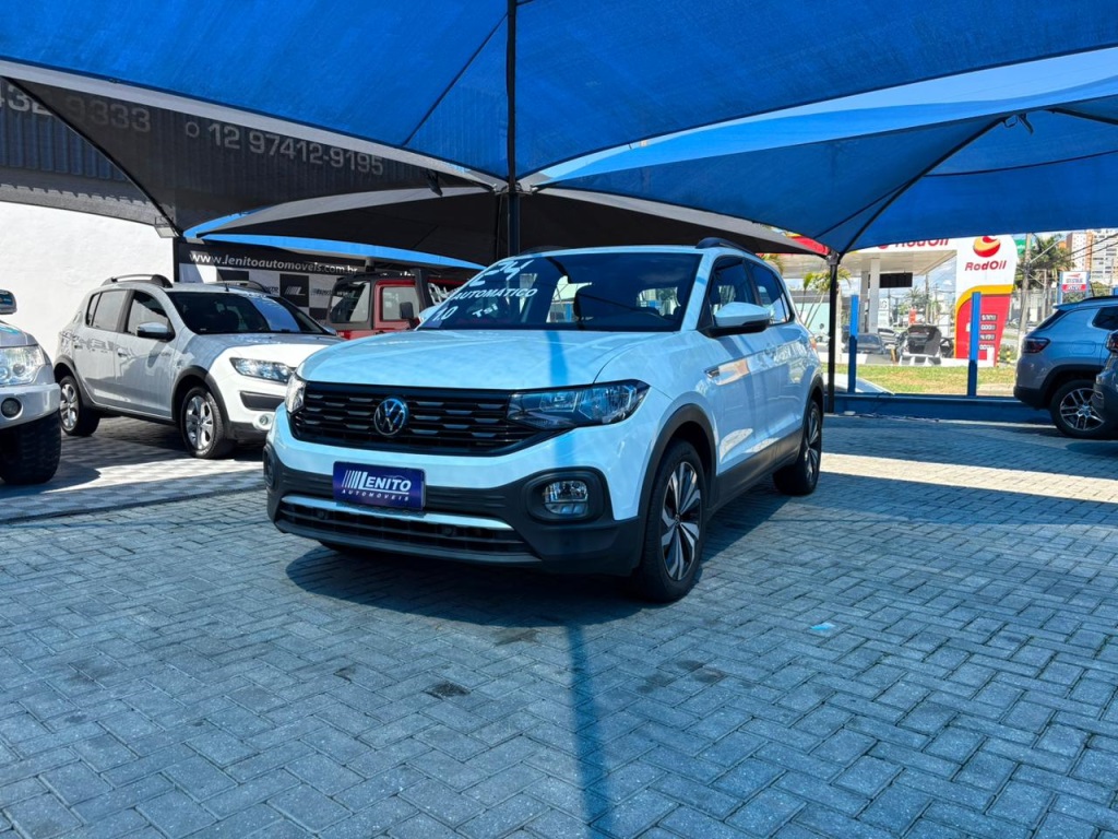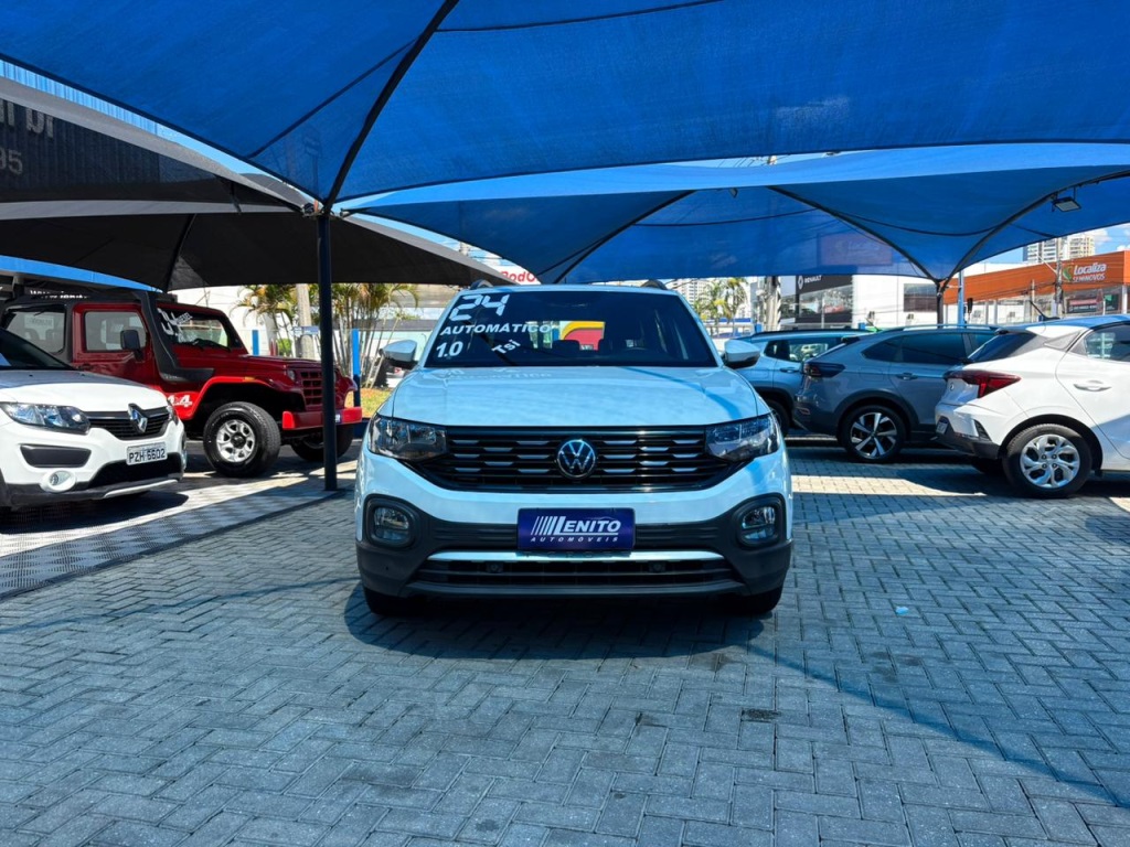 Volkswagen T-Cross Comfortline TSI automático, SUV branco 2024, moderno para cidade e estrada. Direção elétrica, ar-condicionado digital, multimídia com CarPlay/Android Auto, câmera de ré, sensores dianteiro e traseiro, piloto automático, chave presencial e partida por botão. Faróis em LED, controles de estabilidade e tração, assistente de rampa, Isofix e múltiplos airbags. Público ideal: famílias e casais urbanos. Pontos fortes: conforto, conectividade e economia. Oportunidade de compra: garanta este T-Cross hoje.