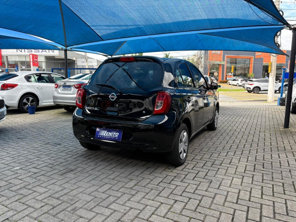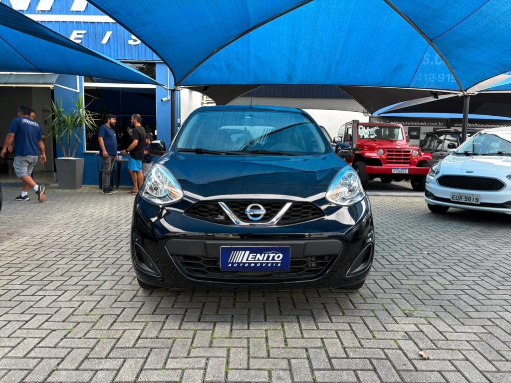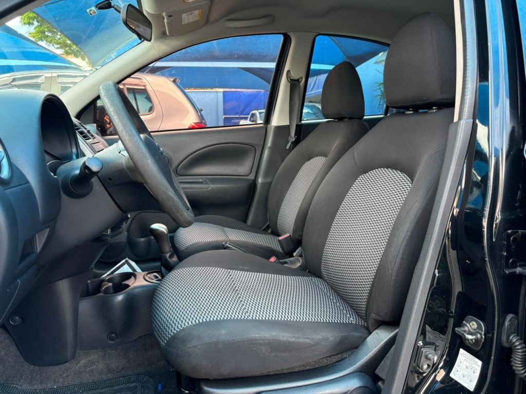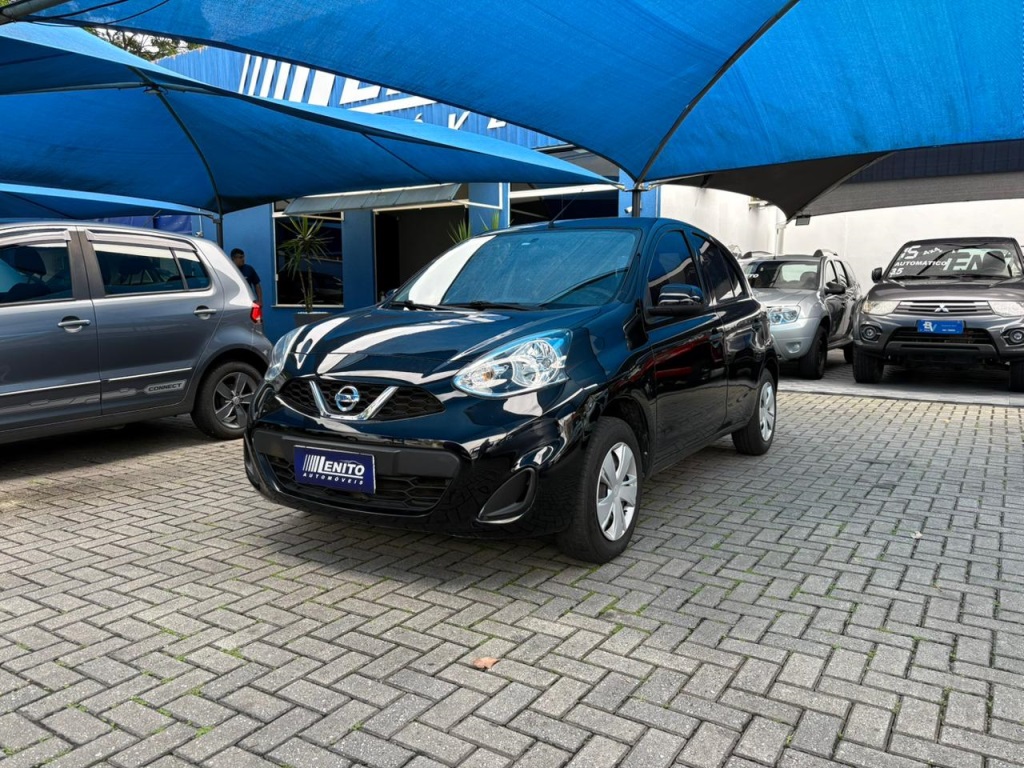 Nissan March S 2018 manual, hatch preto ágil para cidade, viagens curtas e apps, com pegada econômica e fácil de estacionar. Câmbio de 5 marchas, direção elétrica, ar-condicionado, vidros dianteiros e travas elétricas, som com Bluetooth/USB, volante multifuncional, computador de bordo, airbags, ABS e Isofix. Público ideal: primeiros motoristas, famílias compactas e quem busca baixo custo. Forças: consumo, praticidade, manutenção acessível. Oportunidade: garanta este March hoje. | Cor: Preto