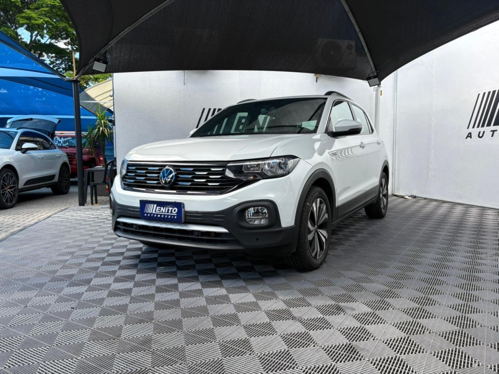 Volkswagen T-Cross Comfortline TSI automático, SUV branco 2024, moderno para cidade e estrada. Direção elétrica, ar-condicionado digital, multimídia com CarPlay/Android Auto, câmera de ré, sensores dianteiro e traseiro, piloto automático, chave presencial e partida por botão. Faróis em LED, controles de estabilidade e tração, assistente de rampa, Isofix e múltiplos airbags. Público ideal: famílias e casais urbanos. Pontos fortes: conforto, conectividade e economia. Oportunidade de compra: garanta este T-Cross hoje.